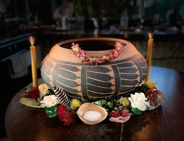 Over the last week, a large ceramic vessel sat center stage on the small oak table in the middle of the house. Made of clay from a stream bed within earshot and adorned in a leaf pattern made from ground ash. She was a gift to my mum, bless her bones, from a dear friend and fellow artist over 30 years ago. Resting lightly on a piece of yellow silk, a gift from Nathalie. The bottom is dressed in a garland of the most fragrant ferns, gardenias and ʻōhiʻa lehua blossoms.